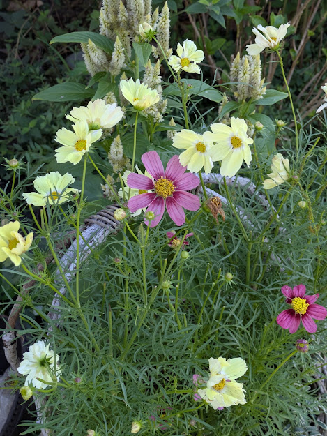 玄関先の籠に淡い黄色とピンクの花びらのコスモスを植えました。開ききったコスモスから色をいただきました