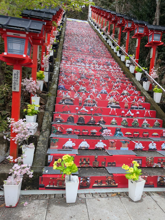 霧雨が降り出していましたが、遠見崎神社の階段に飾られているお雛様を見たいと出かけました。やはり本物は仕舞われていて、パネル展示となっていましたが、様子を垣間見ることはできましたT子さんとは、来年もまた来ましょう!と約束して神社を後にしました
